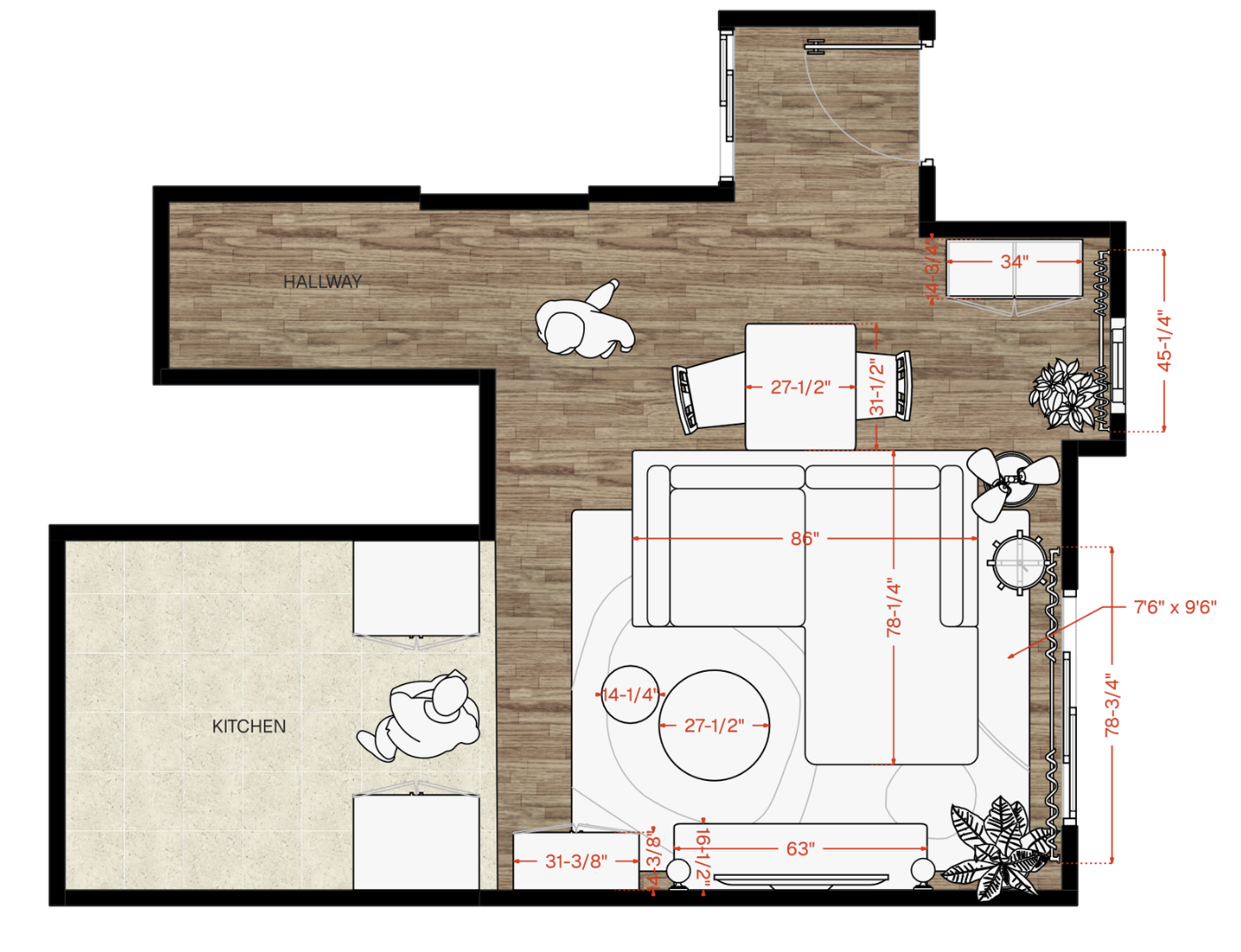 Using your inspiration and your existing space as a foundation, I put together detailed visual mockups and 2D floor plans showing my suggestions. Plus, you’ll also receive links to recommended products.